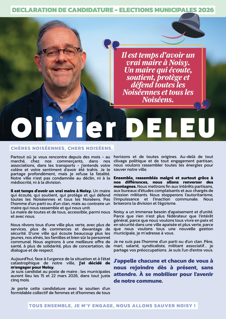 Noiséens, ne vous laissez pas berner par ces faux-semblants, ces guerres d’ombres sur les réseaux. Soutenez Olivier Deleu pour une ville plus verte, plus juste, plus connectée.