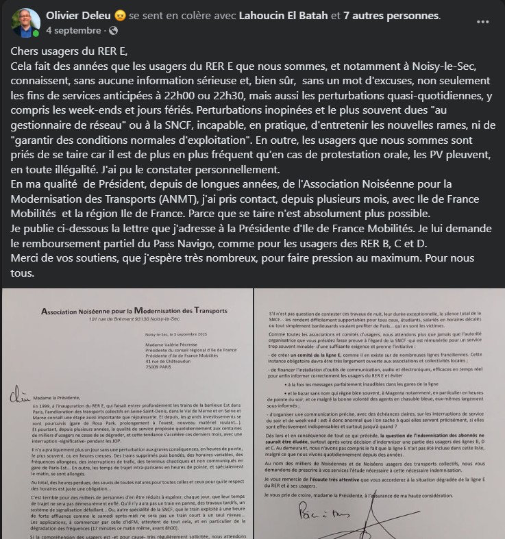 Car le 4 septembre dernier, cet homme a fait ce que peu osent : écrire publiquement à Valérie Pécresse, présidente d’Île-de-France Mobilités, pour exiger un remboursement partiel pour les usagers du RER E.