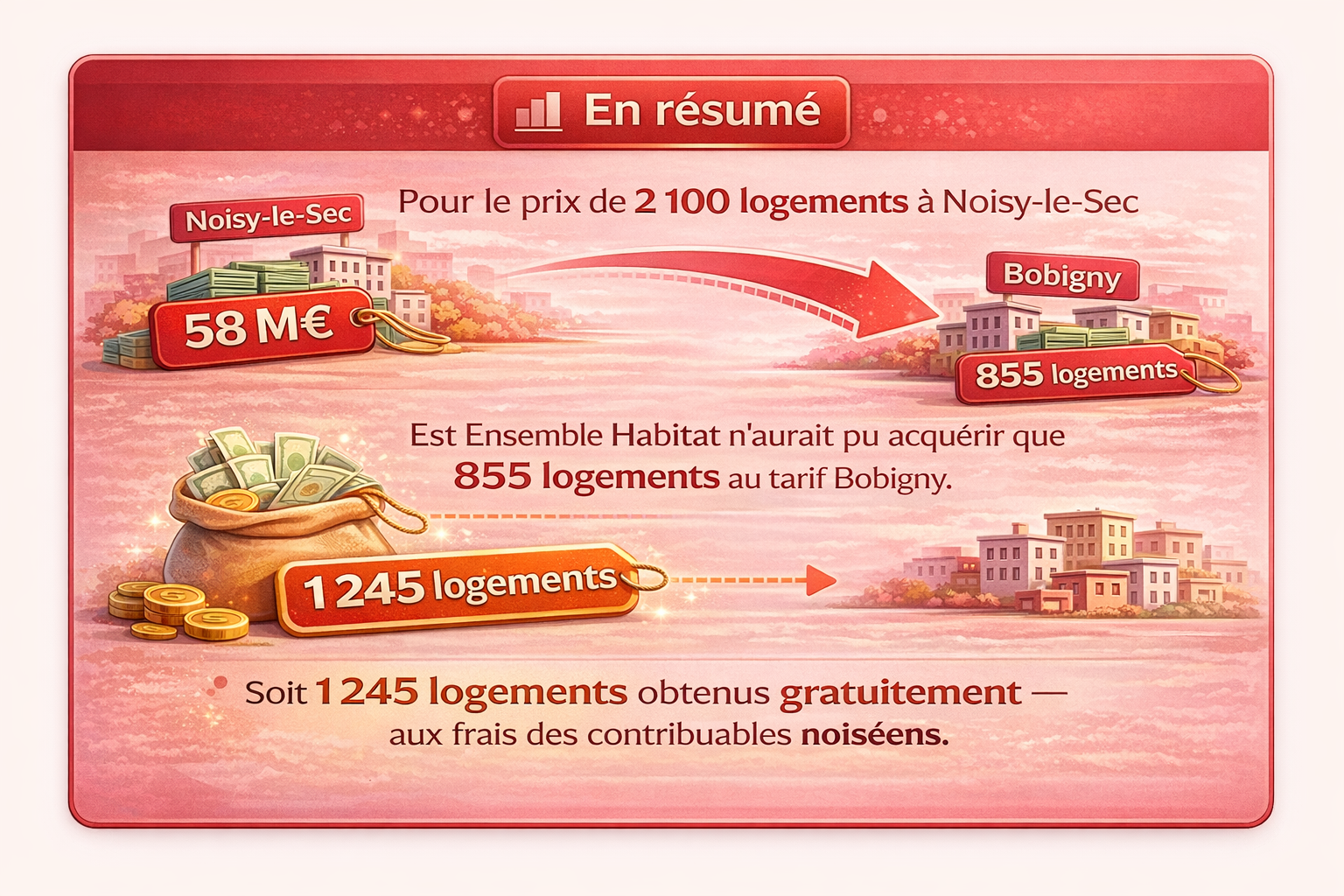L’Office Public de l’Habitat Est Ensemble Habitat vient d’acquérir 191 logements à Bobigny pour 12,95 millions d’euros. Quelques mois plus tôt, il rachetait 2 100 logements à Noisy-le-Sec pour 58 millions. Un simple calcul révèle une valorisation étonnamment variable. Quand Est Ensemble Habitat achète 191 logements à Bobigny pour 67 800 € l’unité, tout le monde applaudit. Mais quand le même OPH acquiert 2 100 logements noiséens pour seulement 27 619 € pièce, personne ne s’interroge. Personne, sauf peut-être le Tribunal administratif de Montreuil. Car derrière ces chiffres se cache une question embarrassante : pourquoi le patrimoine des Noiséens vaut-il 2,45 fois moins que celui des Balbyniens ?