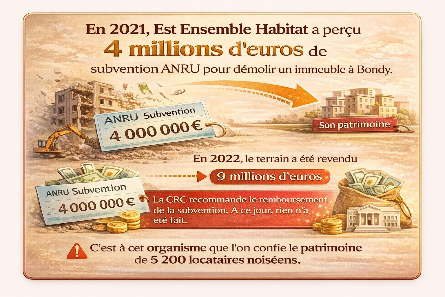 En 2021, Est Ensemble Habitat a perçu 4 millions d’euros de subvention ANRU pour démolir un immeuble à Bondy. En 2022, le terrain a été revendu 9 millions d’euros. La CRC recommande le remboursement de la subvention. À ce jour, rien n’a été fait.