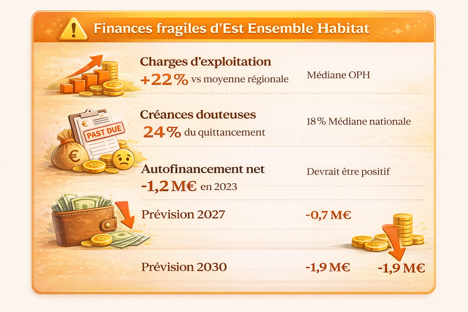 Le rapport d’observations définitives de la CRC Île-de-France (29 mai 2024) dresse un portrait accablant d’Est Ensemble Habitat. Loin d’être un acquéreur solide, l’OPH traîne un passif financier et des défaillances de gestion qui interrogent sur sa capacité à tenir ses promesses.