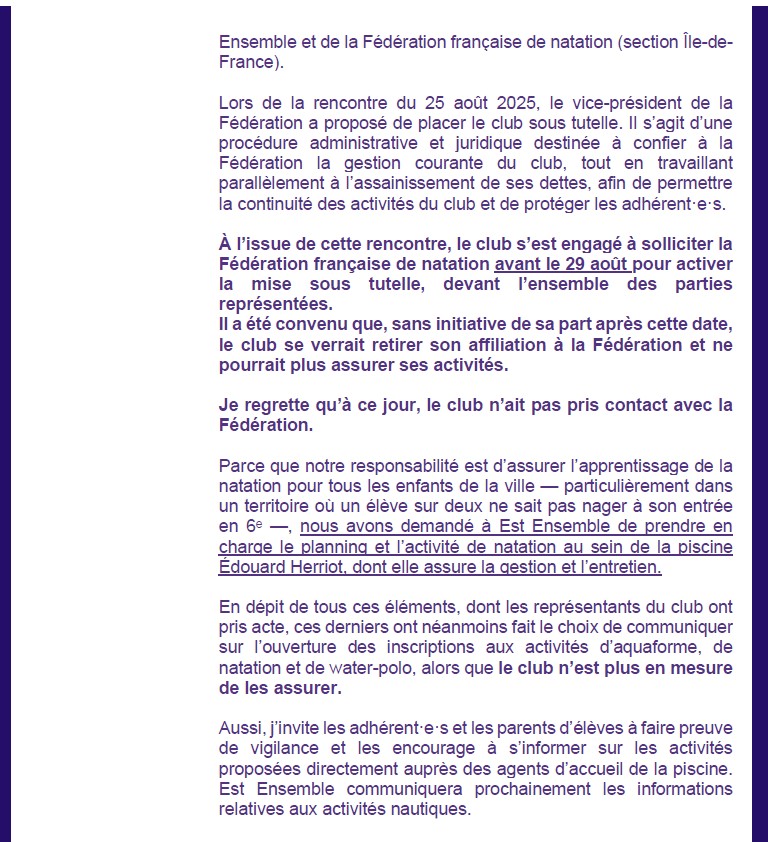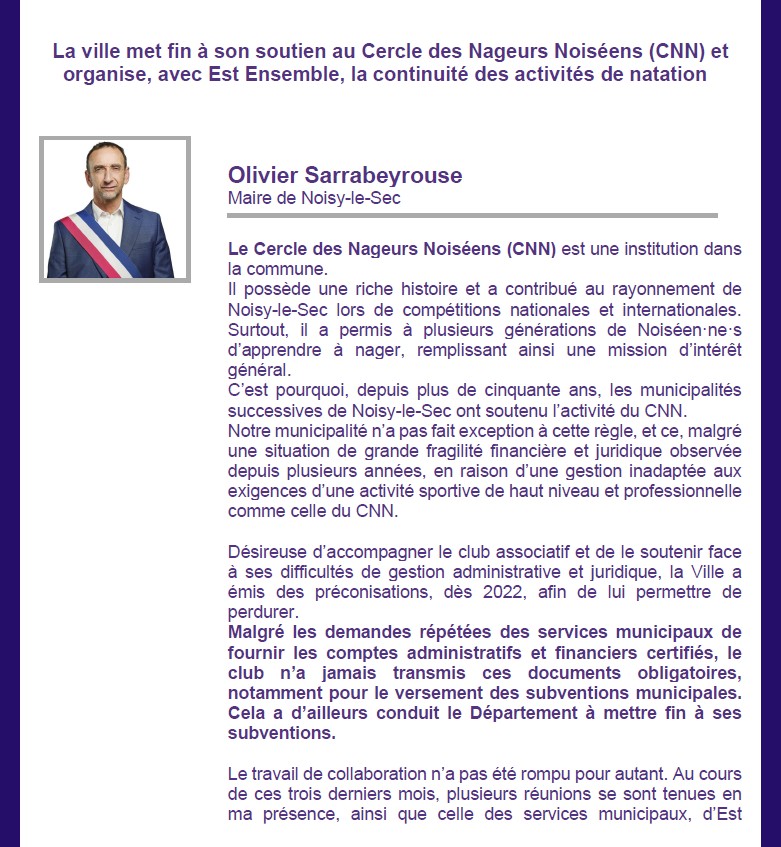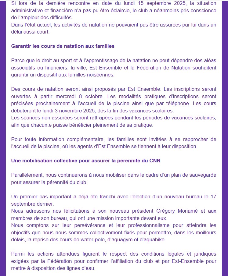 Quant à moi, j’enfonce le clou : « Est Ensemble prétend assurer la ‘continuité du savoir nager’ avec 120 places alors que 310 enfants attendent. Aujourd’hui, ils annoncent qu’aucun créneau ne sera attribué au CNN. C’est un aveu : il n’a jamais été question d’accompagner le club. Il s’agissait de le remplacer. »
