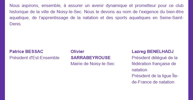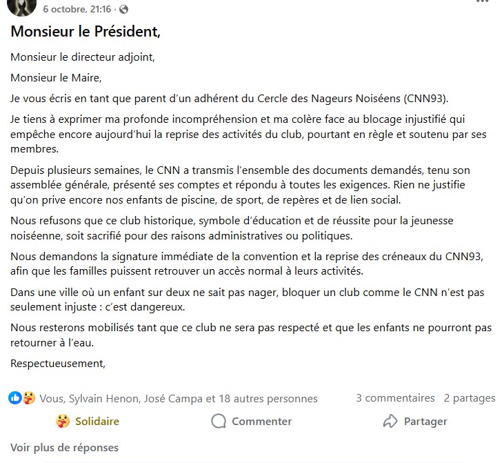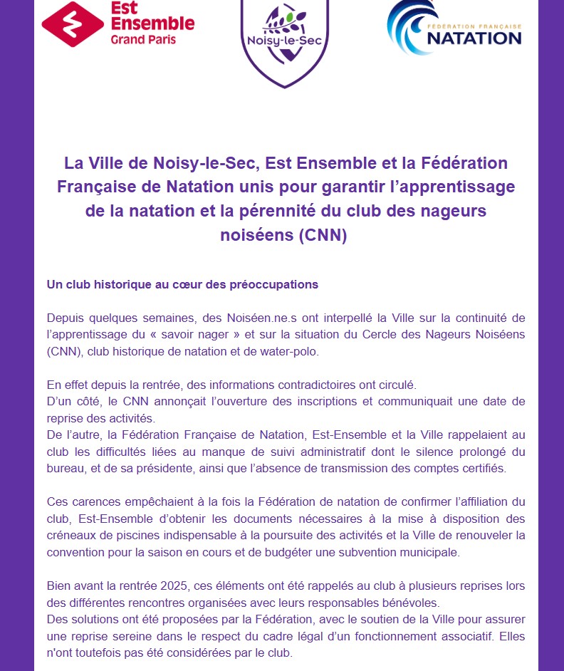 Face à ce constat, c’est collectivement que parents, bénévoles, élus vigilants et citoyens doivent exiger la transparence, le respect du droit, et l’égalité d’accès à l’apprentissage de la natation pour tous les enfants de Noisy-le-Sec.