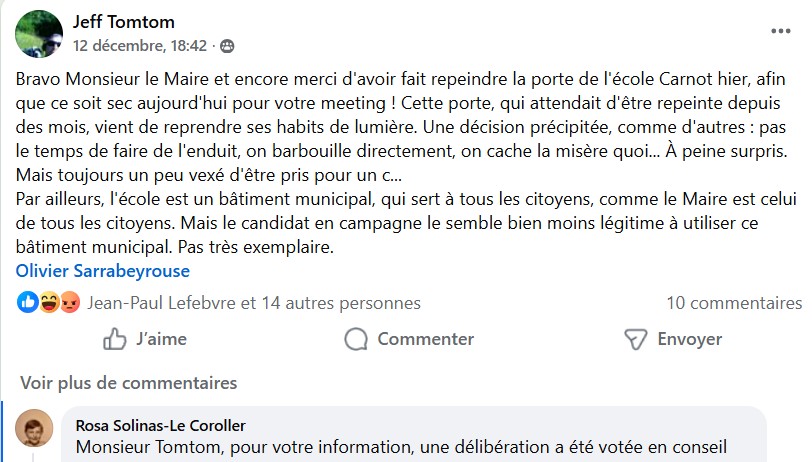Bonus comique : la porte de l’établissement aurait été repeinte la veille. Comme quoi une échéance électorale accélère singulièrement les travaux réclamés en vain le reste du mandat.