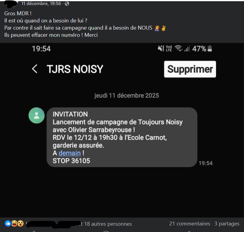 Un témoignage savoureux nous est parvenu : une personne n’habitant pas Noisy-le-Sec, mais ayant eu le malheur d’assister aux vœux municipaux de janvier 2024, s’est retrouvée destinataire d’une invitation au lancement de campagne du Maire.