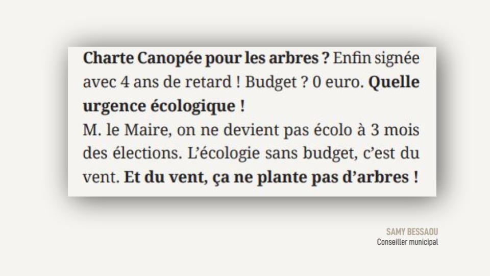 Pourquoi avoir attendu la période préélectorale pour signer cette charte, alors que nos voisins l’ont fait il y a plus de trois ans ? Quel budget sera réellement consacré aux arbres en 2026, et dans les années suivantes ? Pourquoi n’avoir jamais candidaté aux appels à projets départementaux entre 2022 et 2025, alors que d’autres communes en ont bénéficié ?