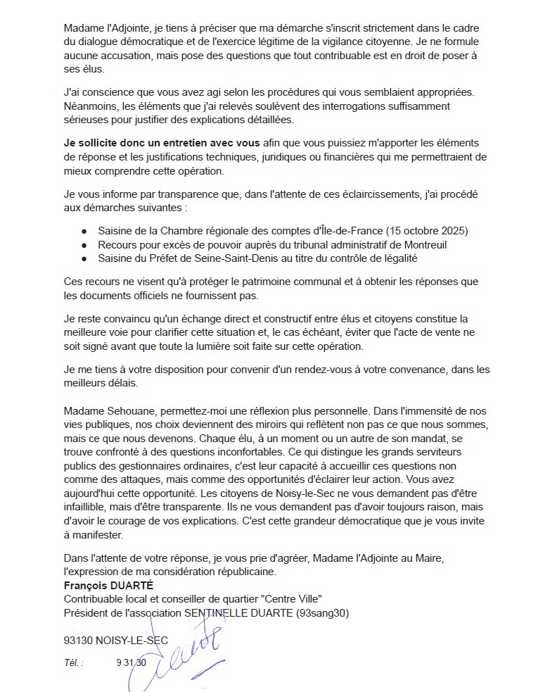Le Préfet de Seine-Saint-Denis a également été saisi pour un contrôle de légalité et un éventuel déféré préfectoral. La chambre régionale des comptes a été sollicitée d’urgence sur cette transaction, perdante pour la ville. Oui, les autorités compétentes ont été sollicitées pour contrôler, s’assurer et garantir le bien fondé et la légalité de cette délibération municipale.